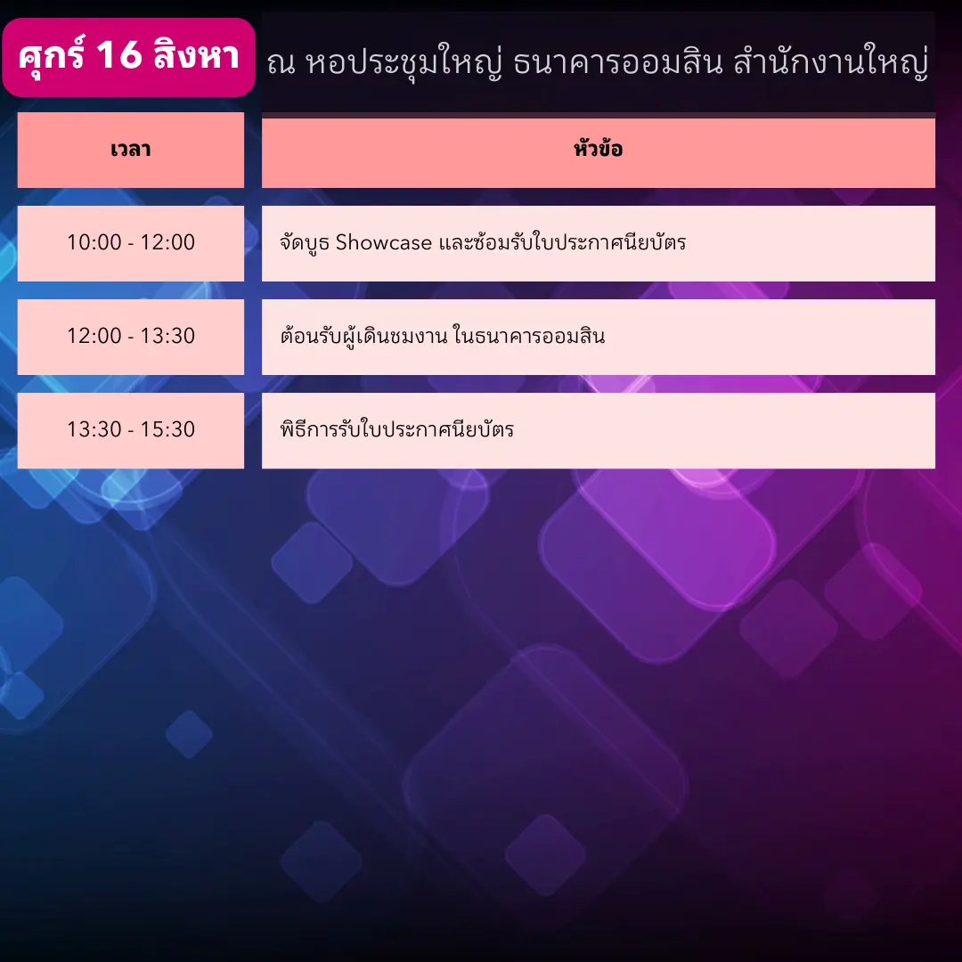 - และนำเสนอธุรกิจและรับใบประกาศนียบัตรใน วันศุกร์ที่ 16 สิงหาคม 2567 ณ หอประชุมใหญ่ ธนาคารออมสิน สำนักงานใหญ่กรุงเทพฯ