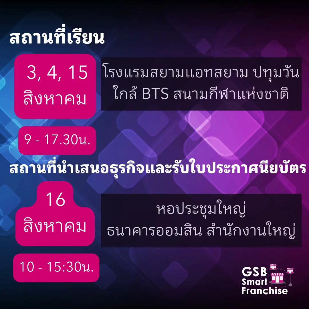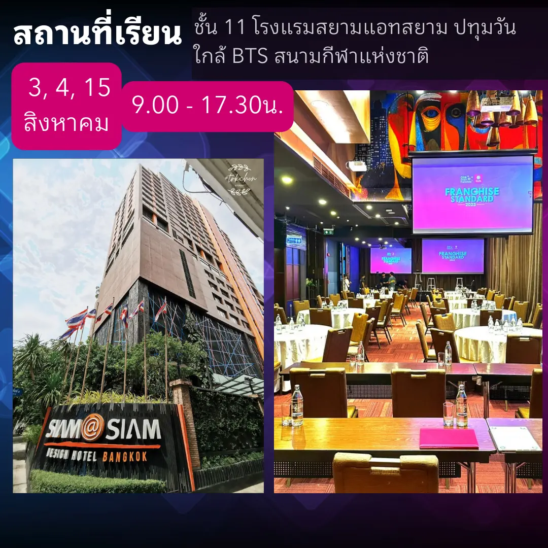 - เรียนวันเสาร์ที่ 3, วันอาทิตย์ที่ 4, และวันพฤหัสบดีที่ 15 สิงหาคม 2567 เวลา: 09:00 – 17:00 น. สถานที่: โรงแรม สยามแอทสยาม กรุงเทพฯ